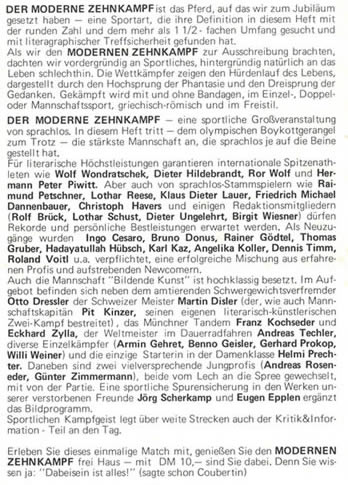 „Zeitschrift für Literatur und Kunst“ "Der moderne Zehnkampf" Herausgeber: Pit Kinzer Redaktion: Rolf Brück, Angeli Hoffmeister, Roman Kern, Rose Maier Haid, Lothar Schust, Dieter Ungelehrt, Birgit Wiesner Konzeption & Layout: Pit Kinzer Satz: Lore Mayer Druck: Sonnentanz-Druck Roland Kron Titelbild: Pit Kinzer 164 S., DinA5, Klebebindung, Auflage 1000 (?) Ex., DM 10,- [> Presse]