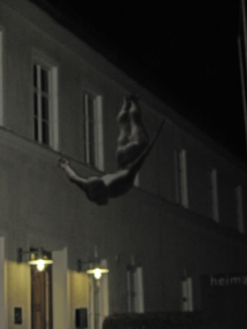 Bei der Eröffnung: Am Pult Museumsleiter Thomas Heitele vor einer Arbeit von Christoph Dittrich, links "Shanghaied II/1" und"Shanghaied I/1", vorne Peter Heel "Nackter Mann ..." |